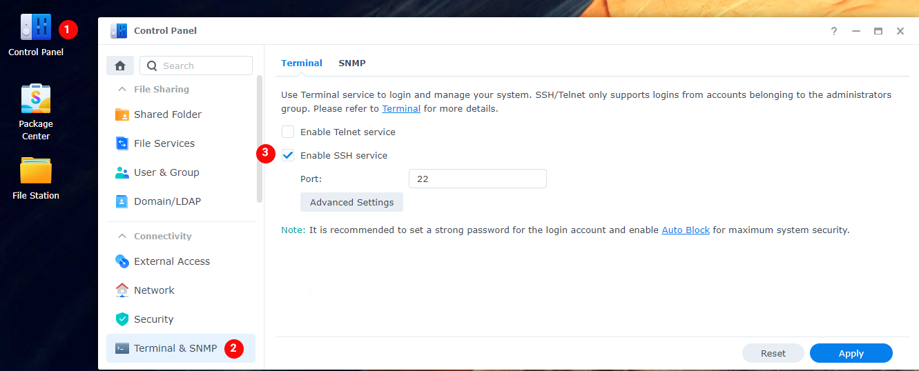 Then use a program like Putty or Powershell/Terminal to SSH into your Synology.