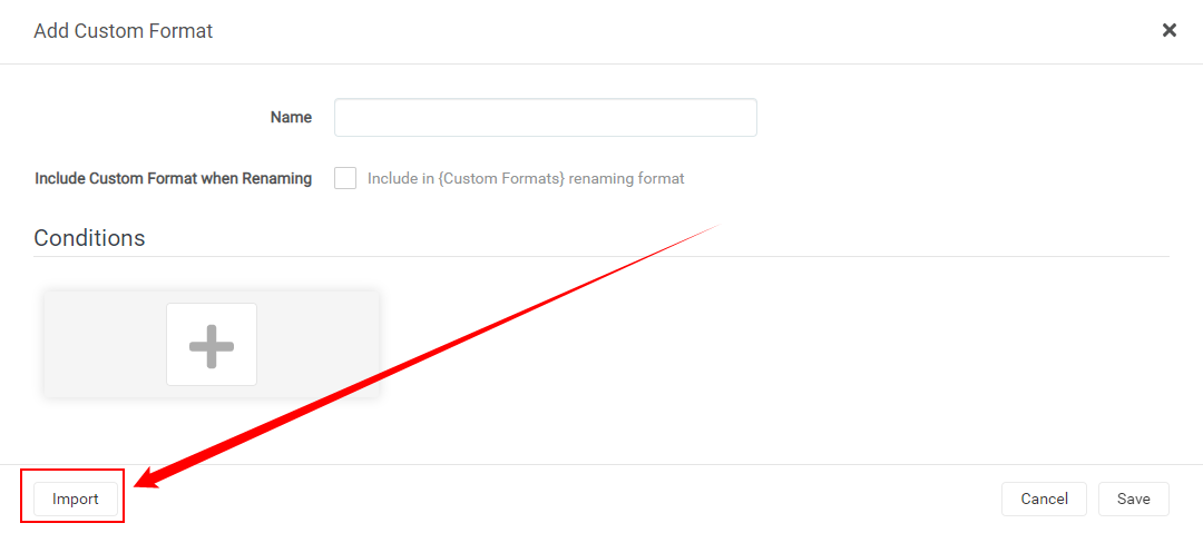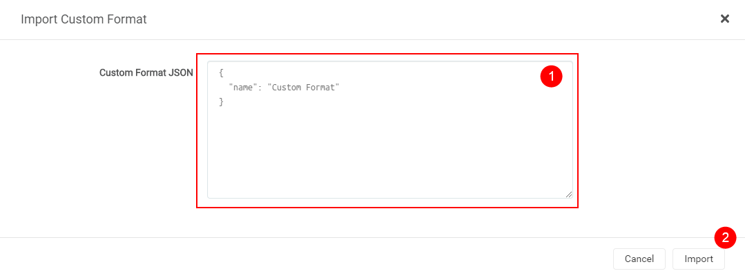 Paste the JSON in the empty Custom Format JSON box (1) that you got from the Custom Format Collection followed by the Import button (2).