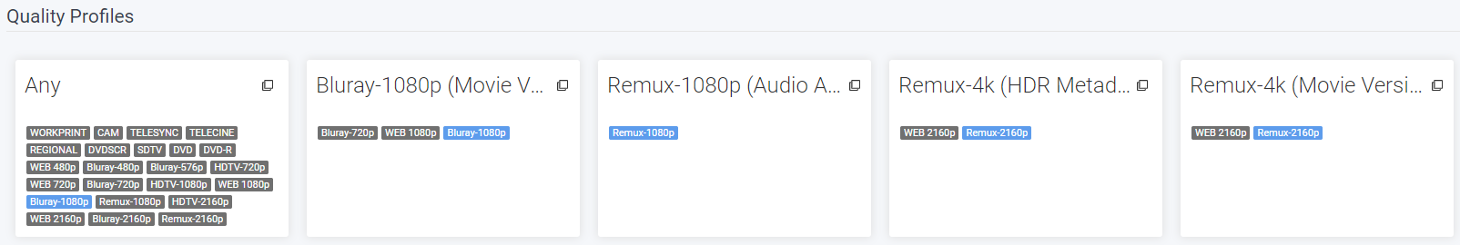 The following Quality Profiles can be combined into a single Quality Profile if you, for example, want to be able to upgrade from 1080p to 4K/2160p when and if it becomes available AFTER the 1080p release is made.
