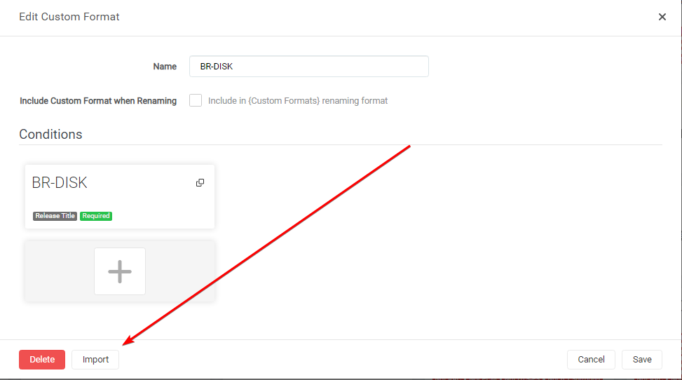 In the empty Custom Format JSON box (1) you just paste the JSON that you got from the Custom Format Collection or provided to you from other sources followed by the Import button (2).